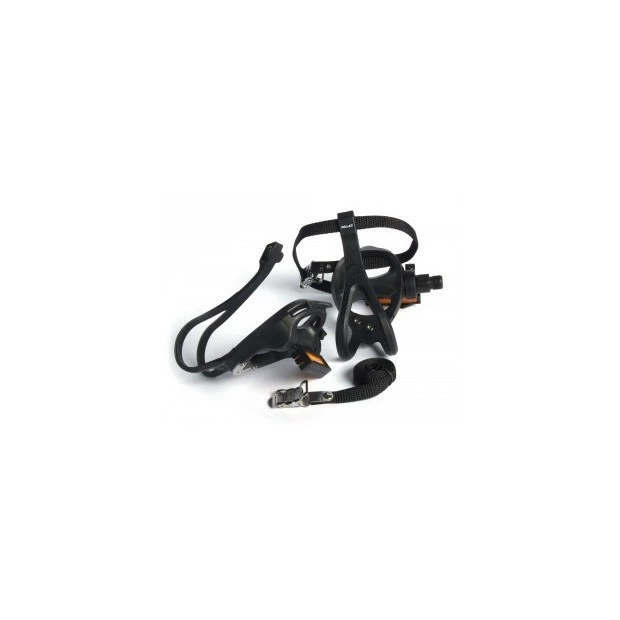 Des pédales route classique en plastique avec axe boron et roulements à billes. Cale-pied et courroies Nylon inclus.